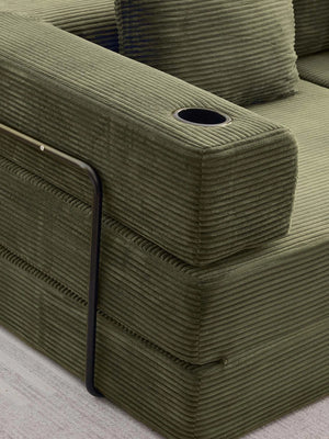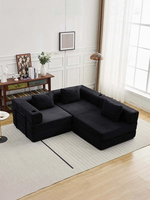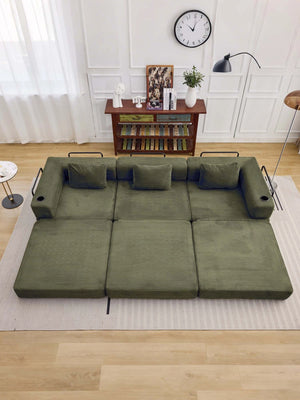 Les assises se déplient complètement pour se transformer en grand canapé-lit — idéal pour se détendre, faire une sieste ou accueillir des invités pour la nuit.