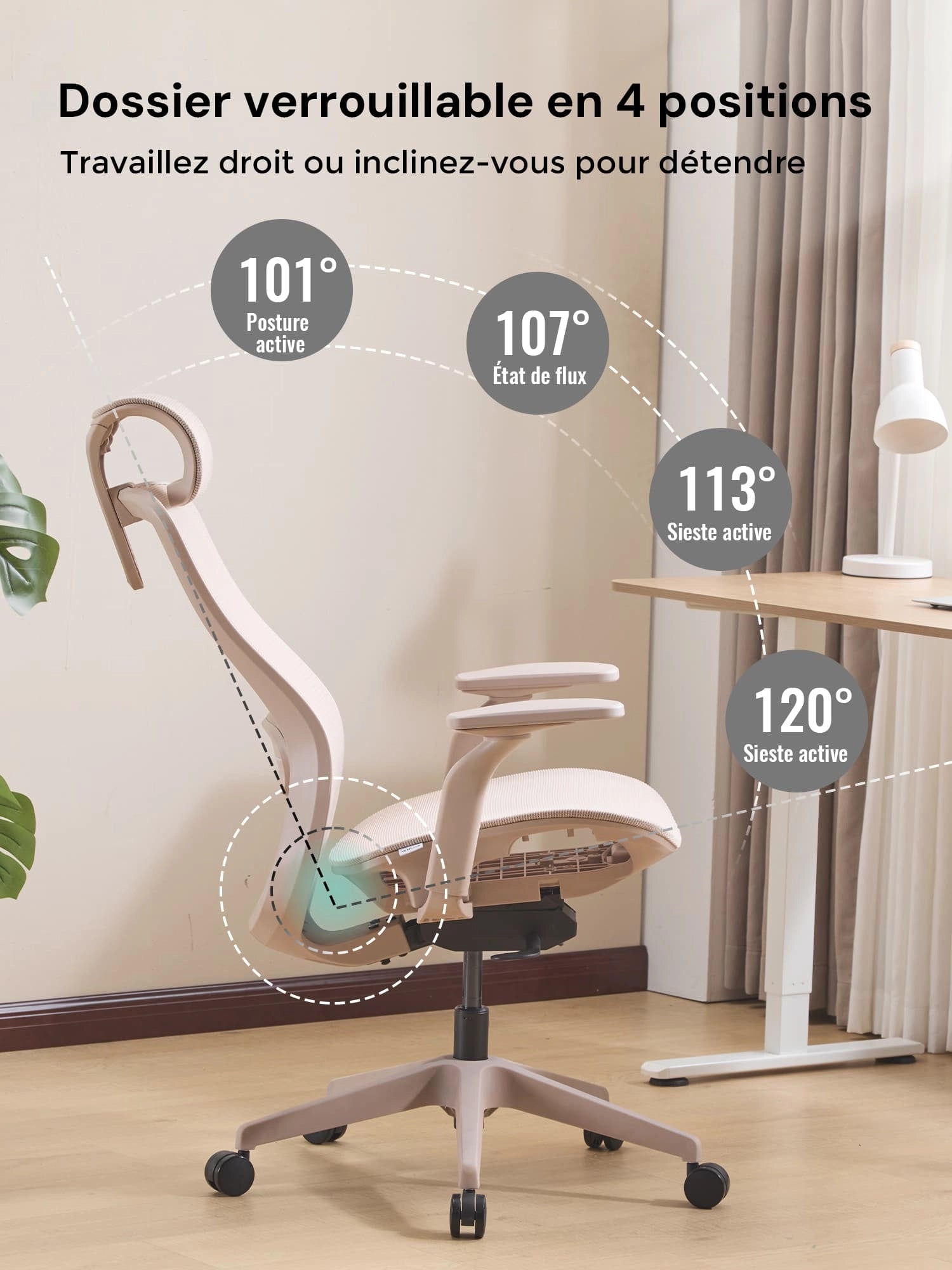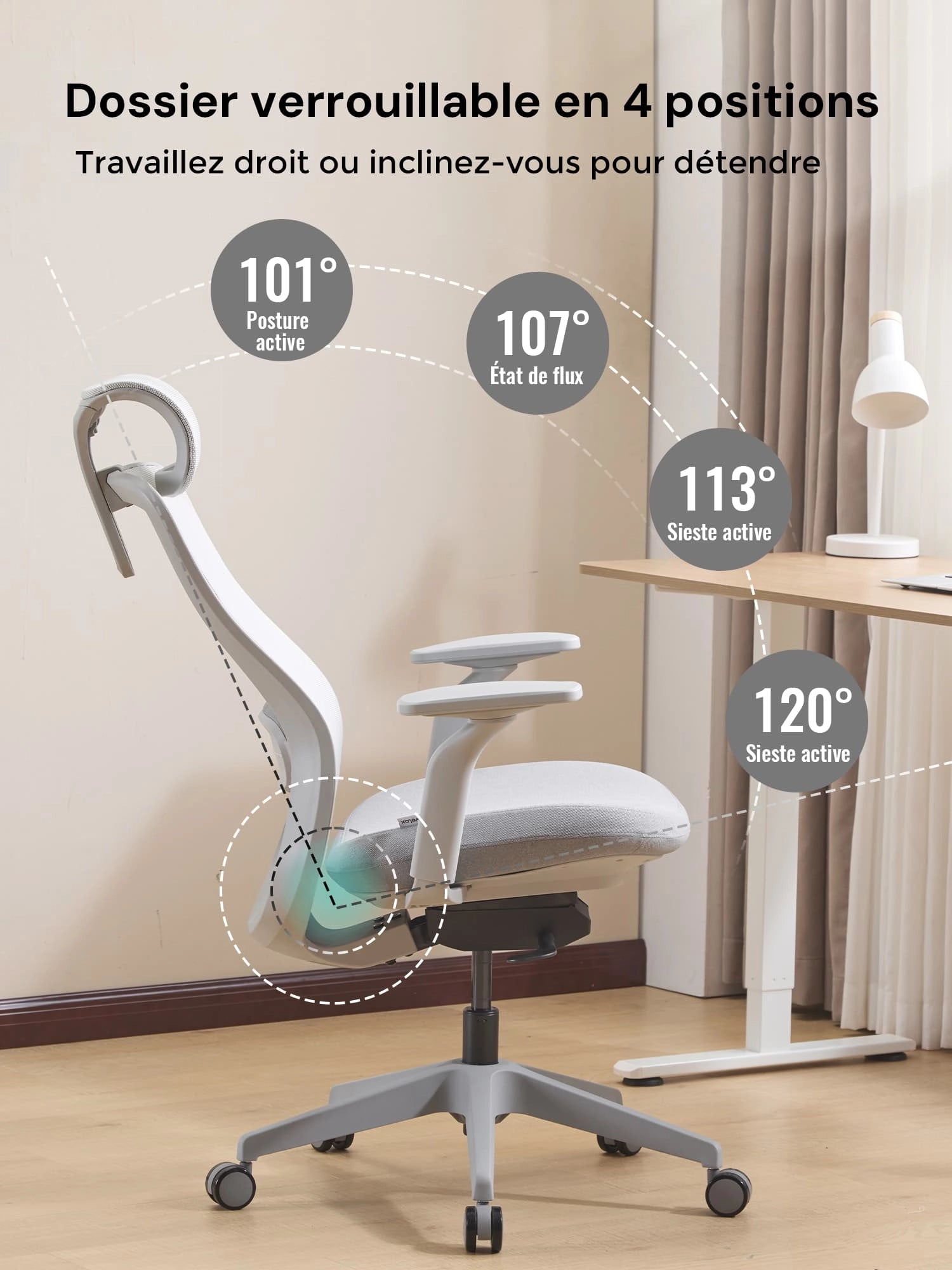 | Positions d’inclinaison du dossier | 101° / 107° / 113° / 120° |