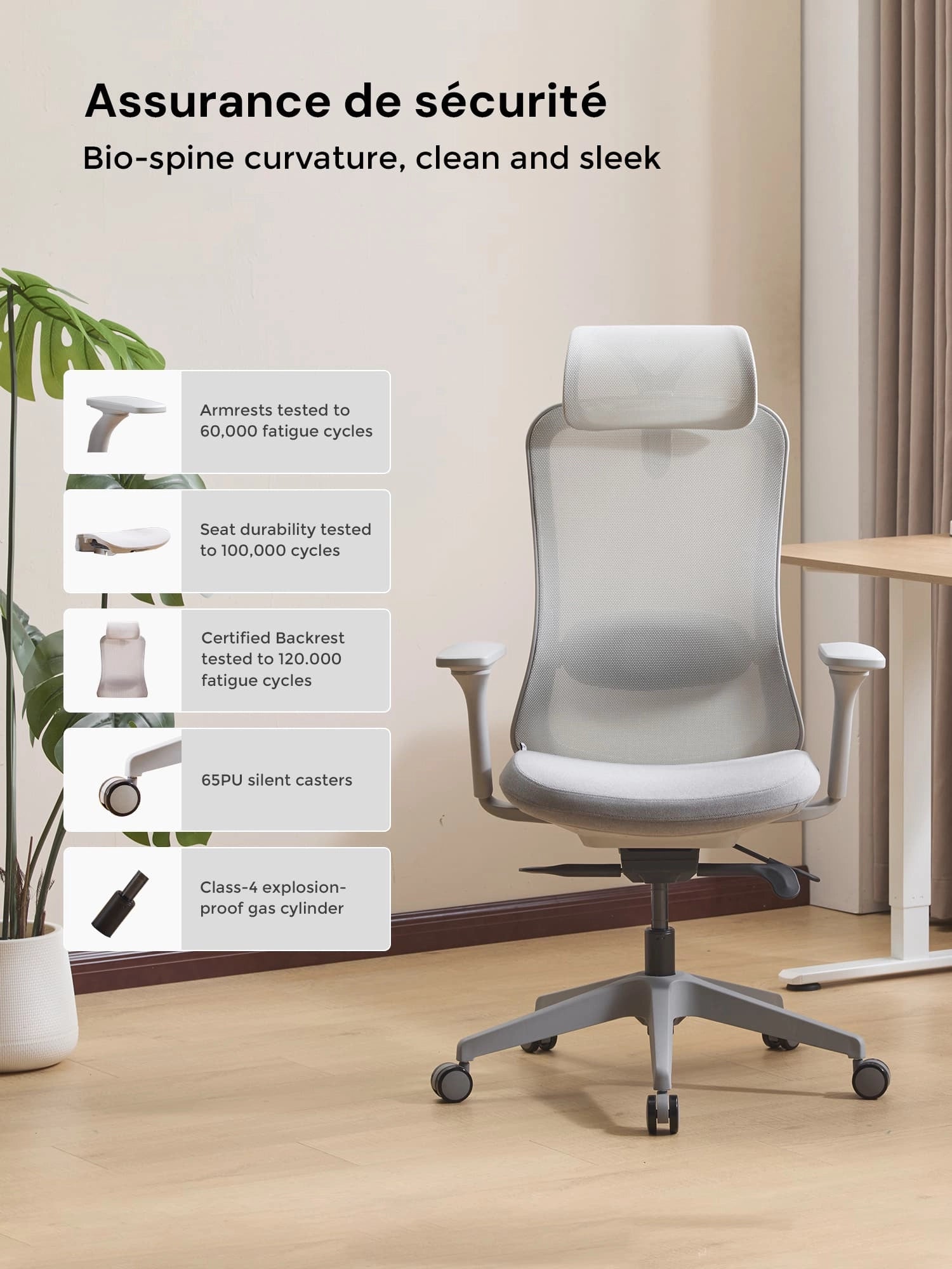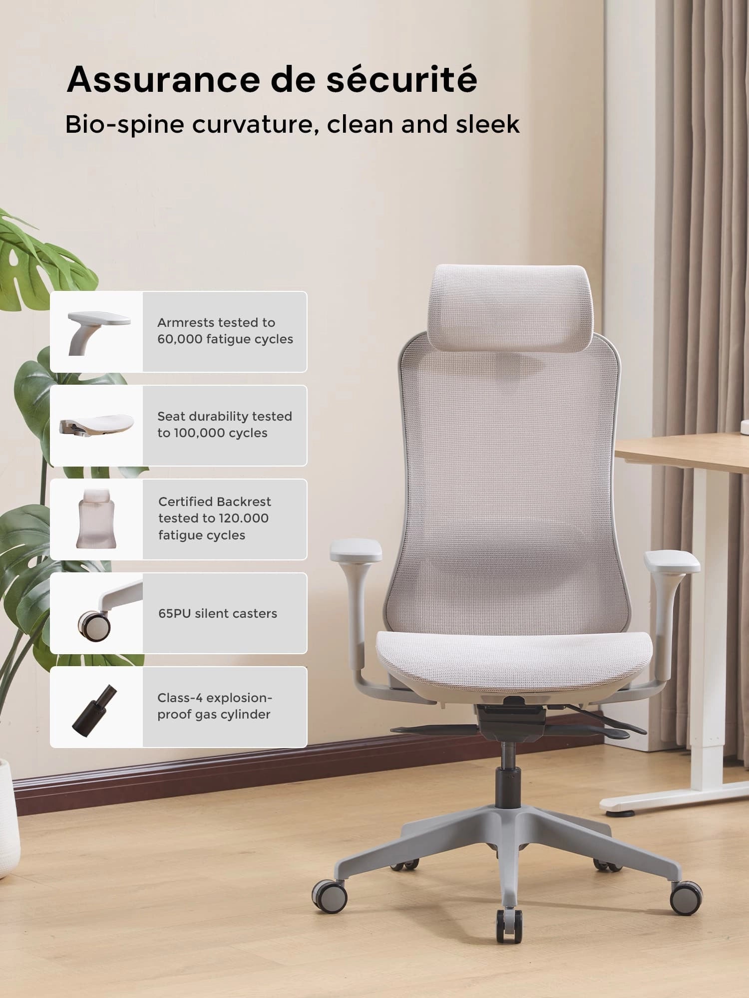La S5 est équipée d’un vérin à gaz de classe 4 et d’une base renforcée, pouvant supporter jusqu’à 136 kg.