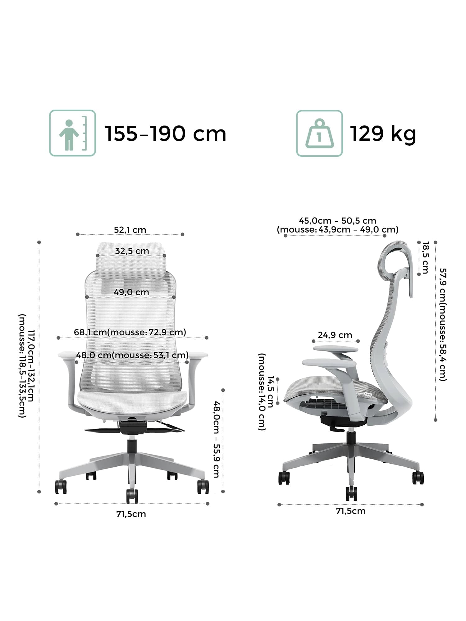 | Hauteur des accoudoirs | 20.32–26.92 cm |