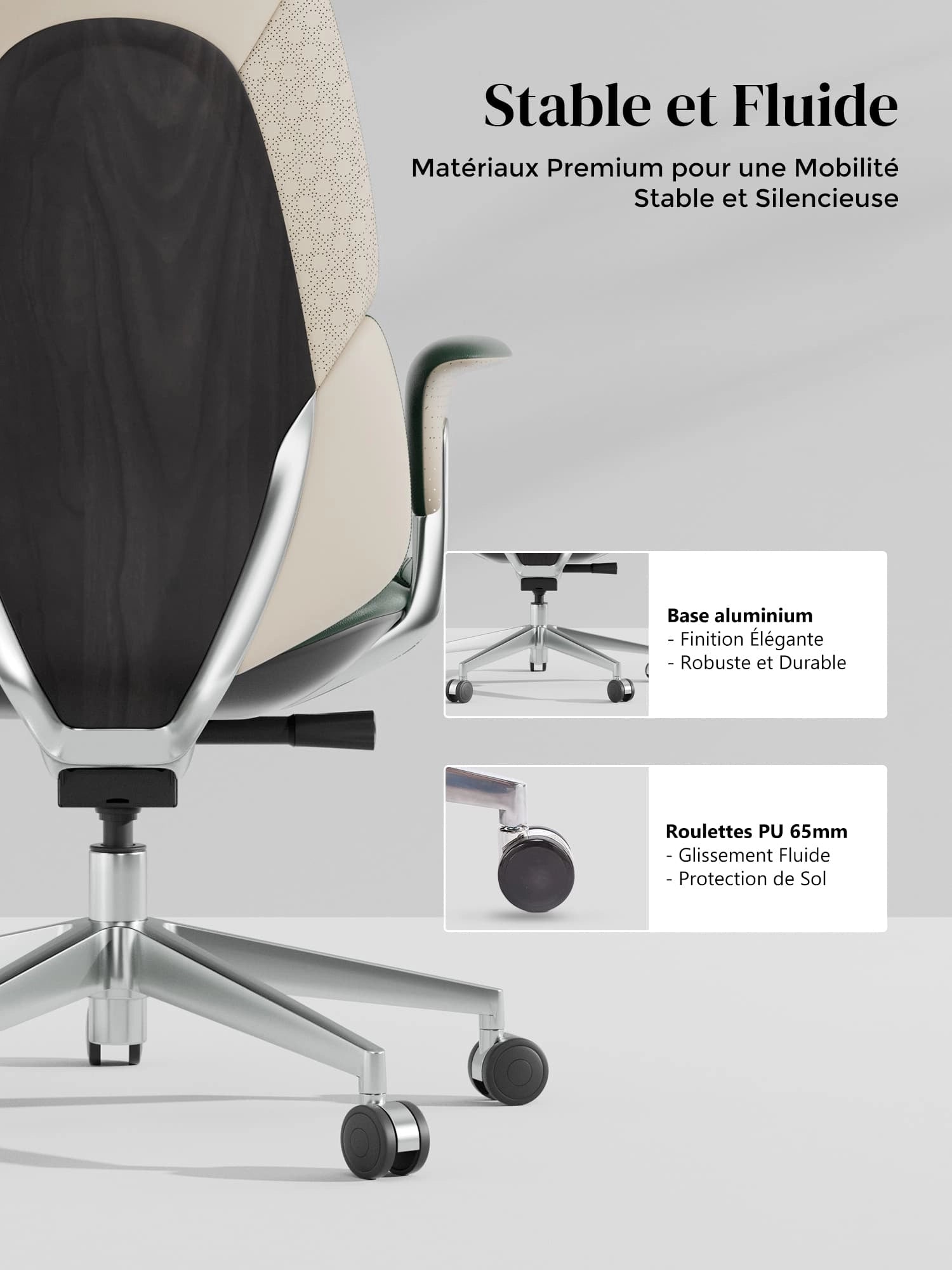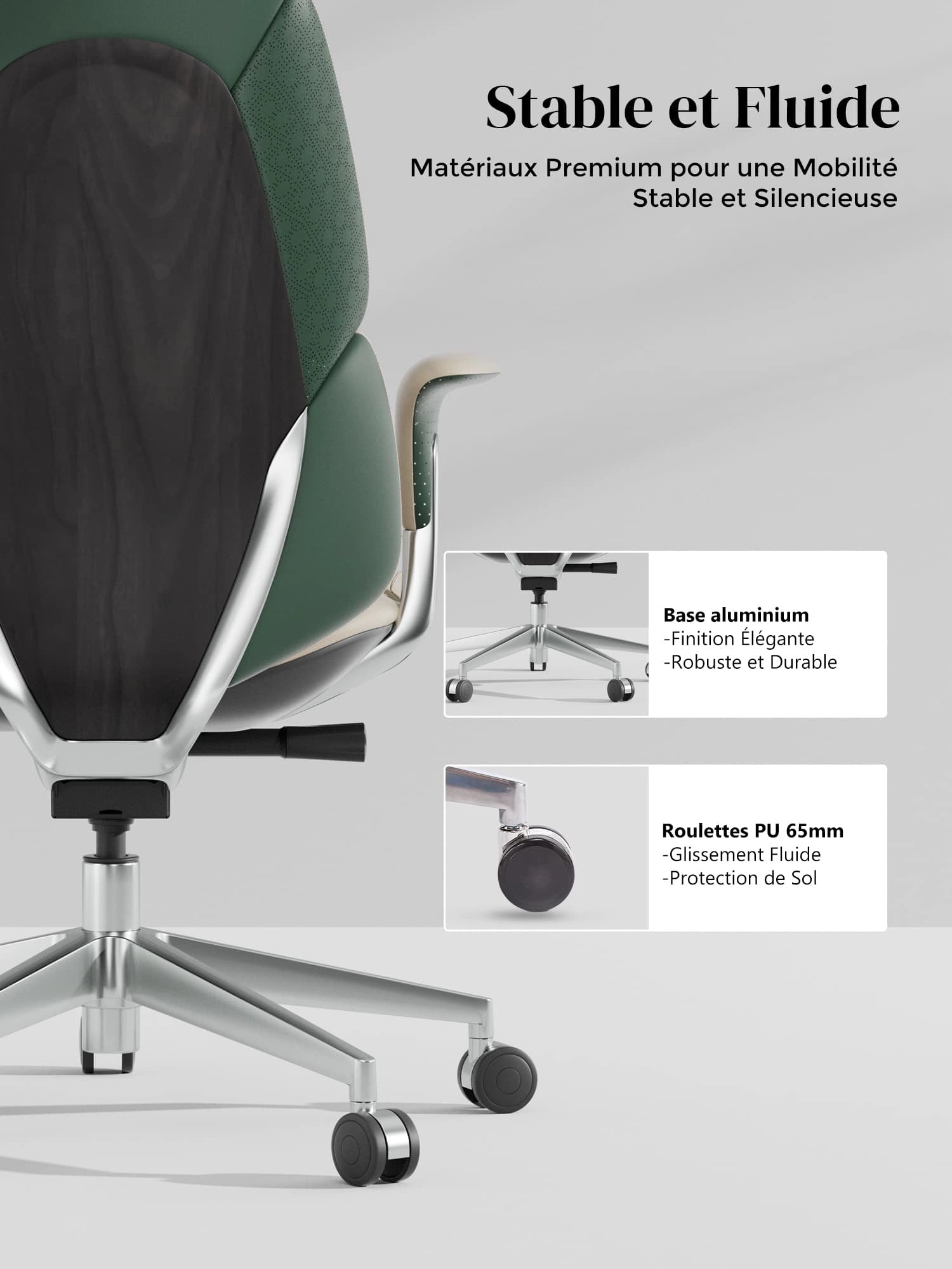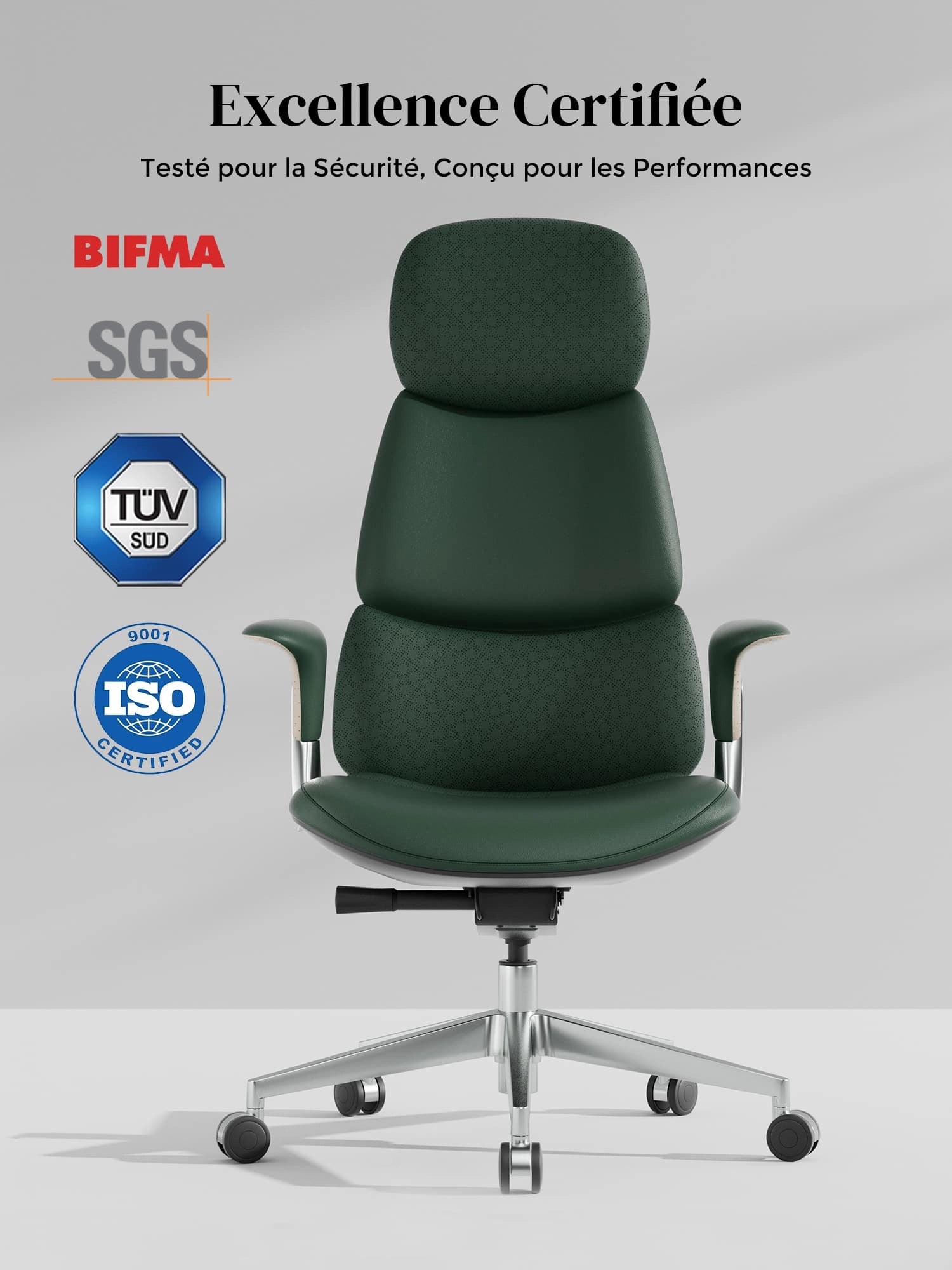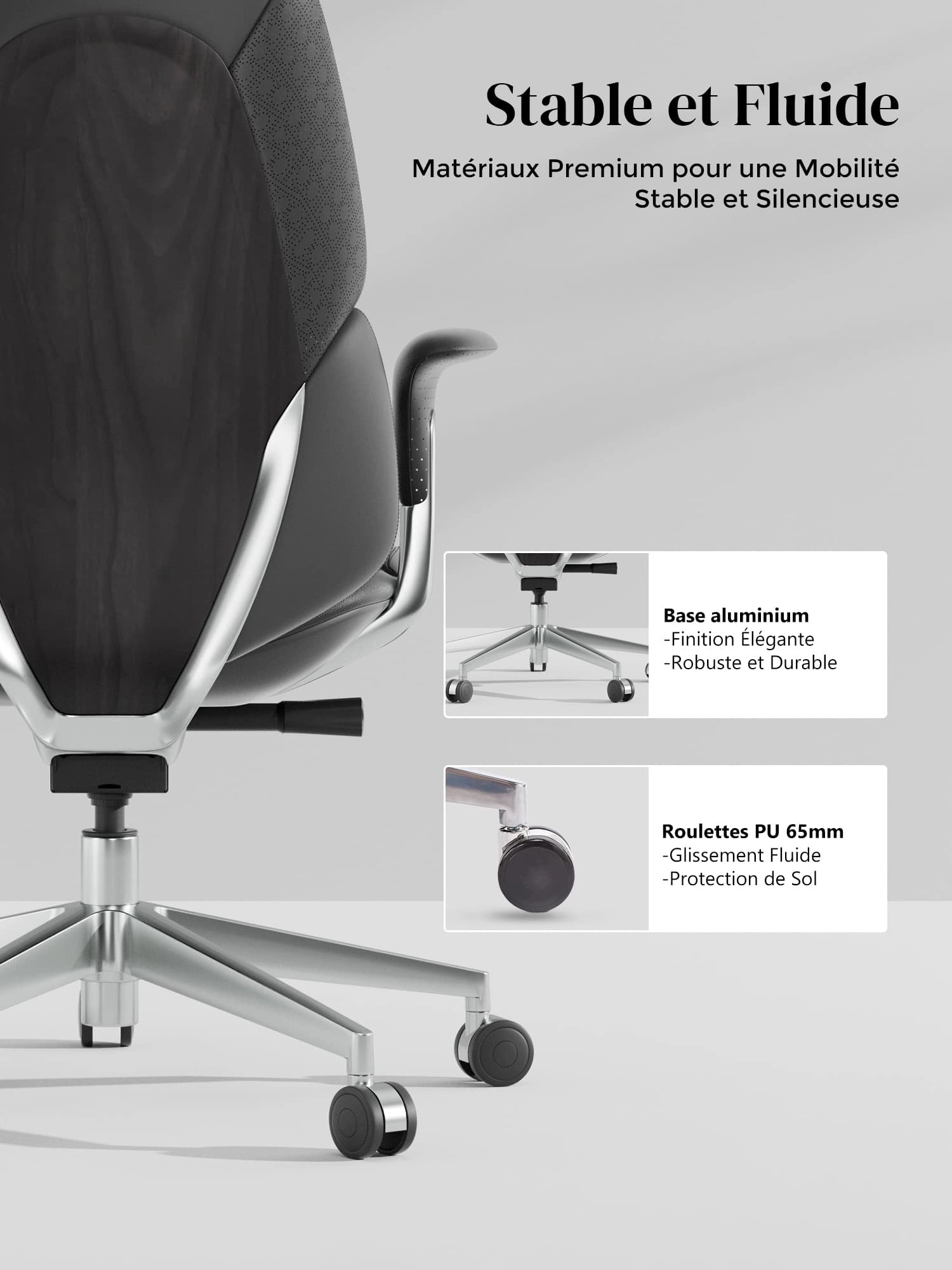 Roulettes silencieuses semi-aluminium haut de gamme, certifiées SGS / Greenguard Gold / normes ergonomiques TÜV.