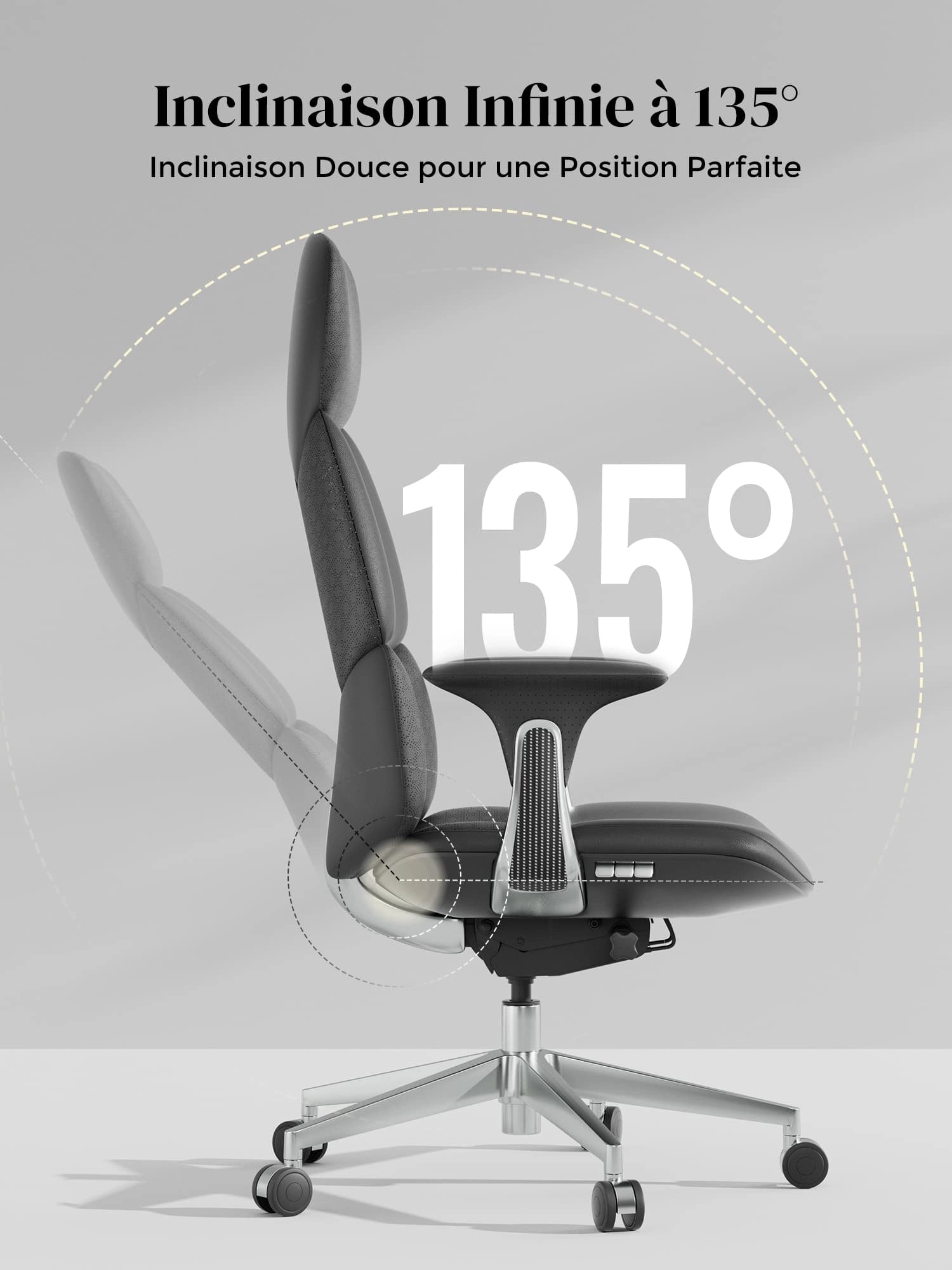 Châssis à contrôle par câble avec trois leviers, verrouillable à n’importe quel angle. Inclinaison jusqu’à 135° et assise coulissante.