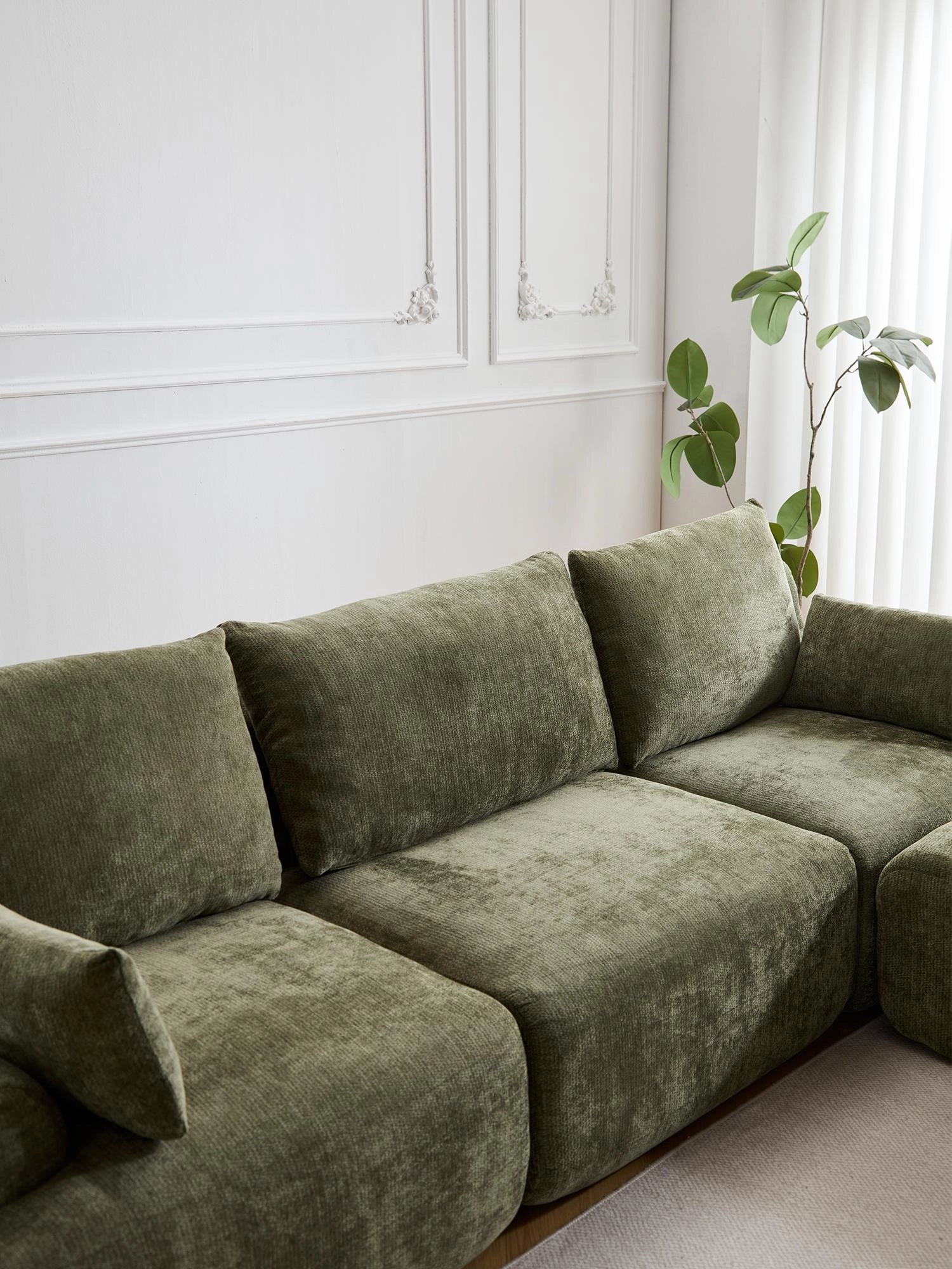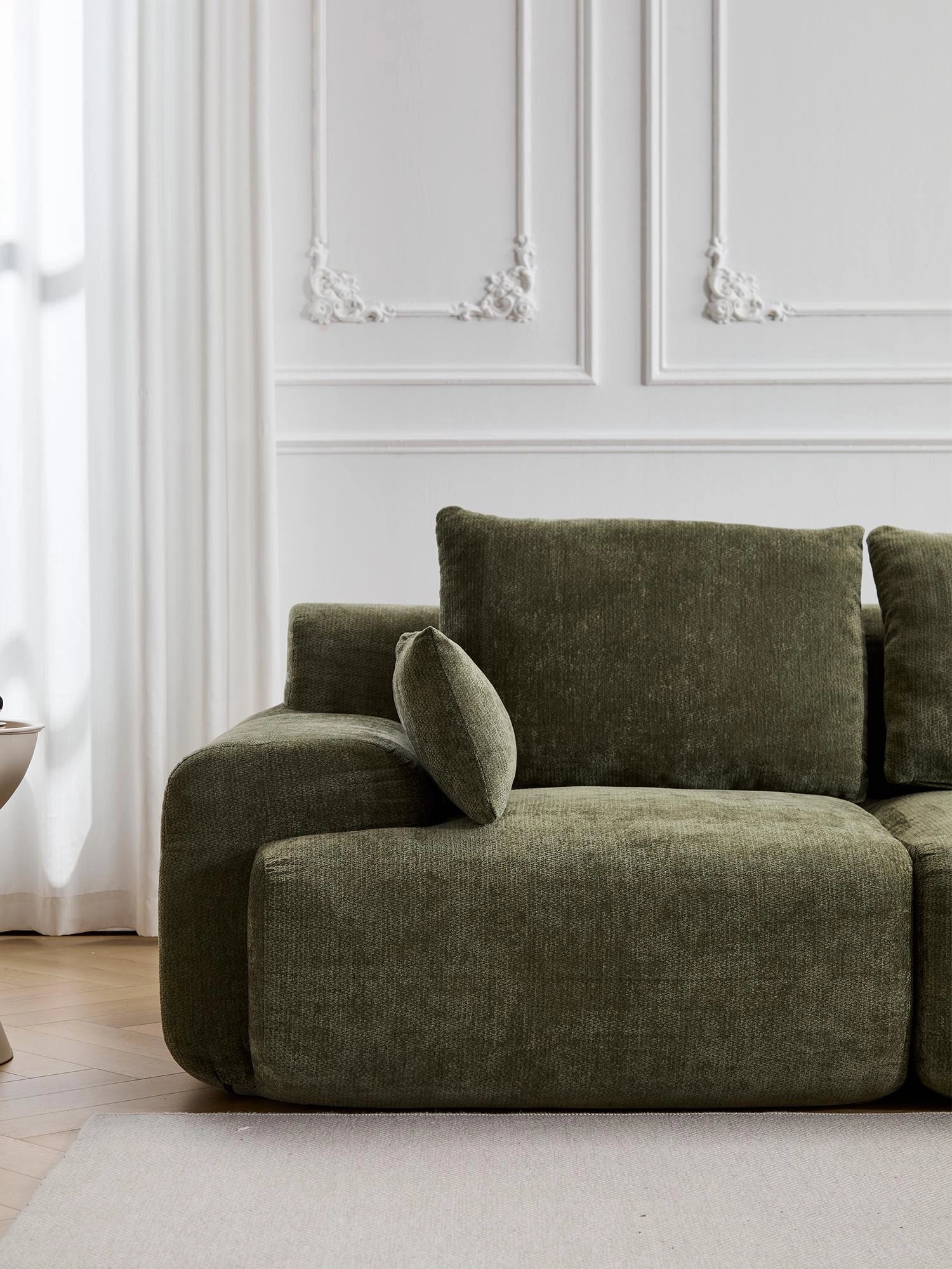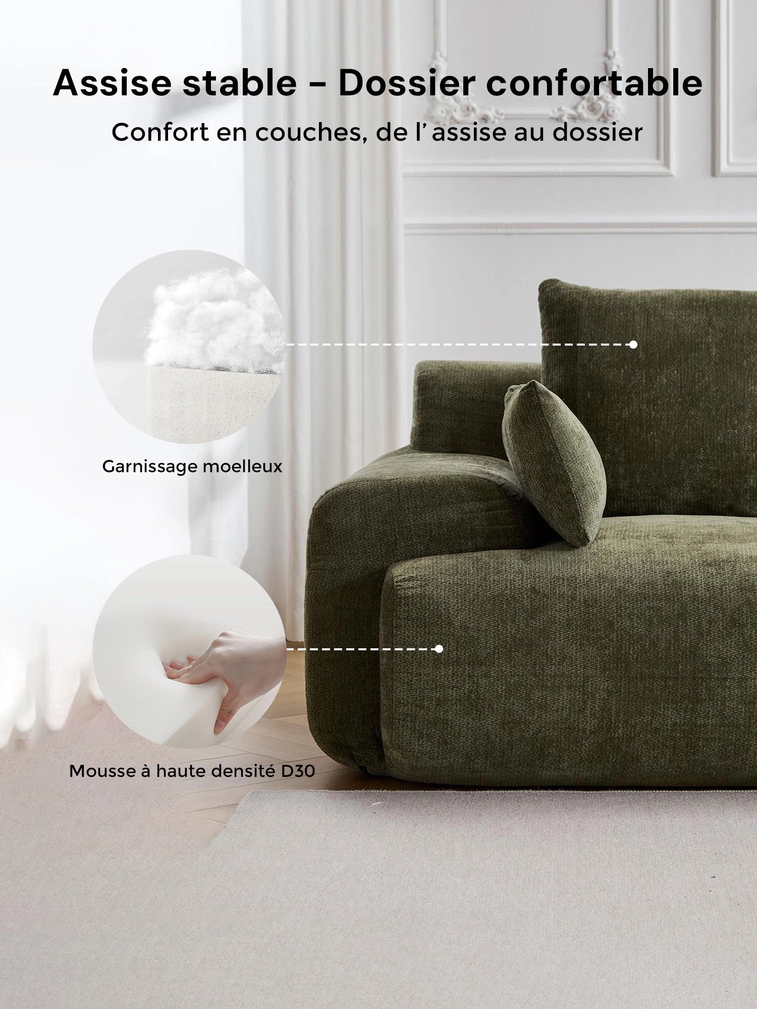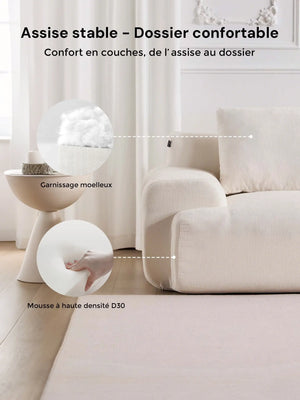 Les coussins structurés assurent un soutien fiable, tandis que les accoudoirs et angles arrondis offrent une silhouette douce et accueillante.