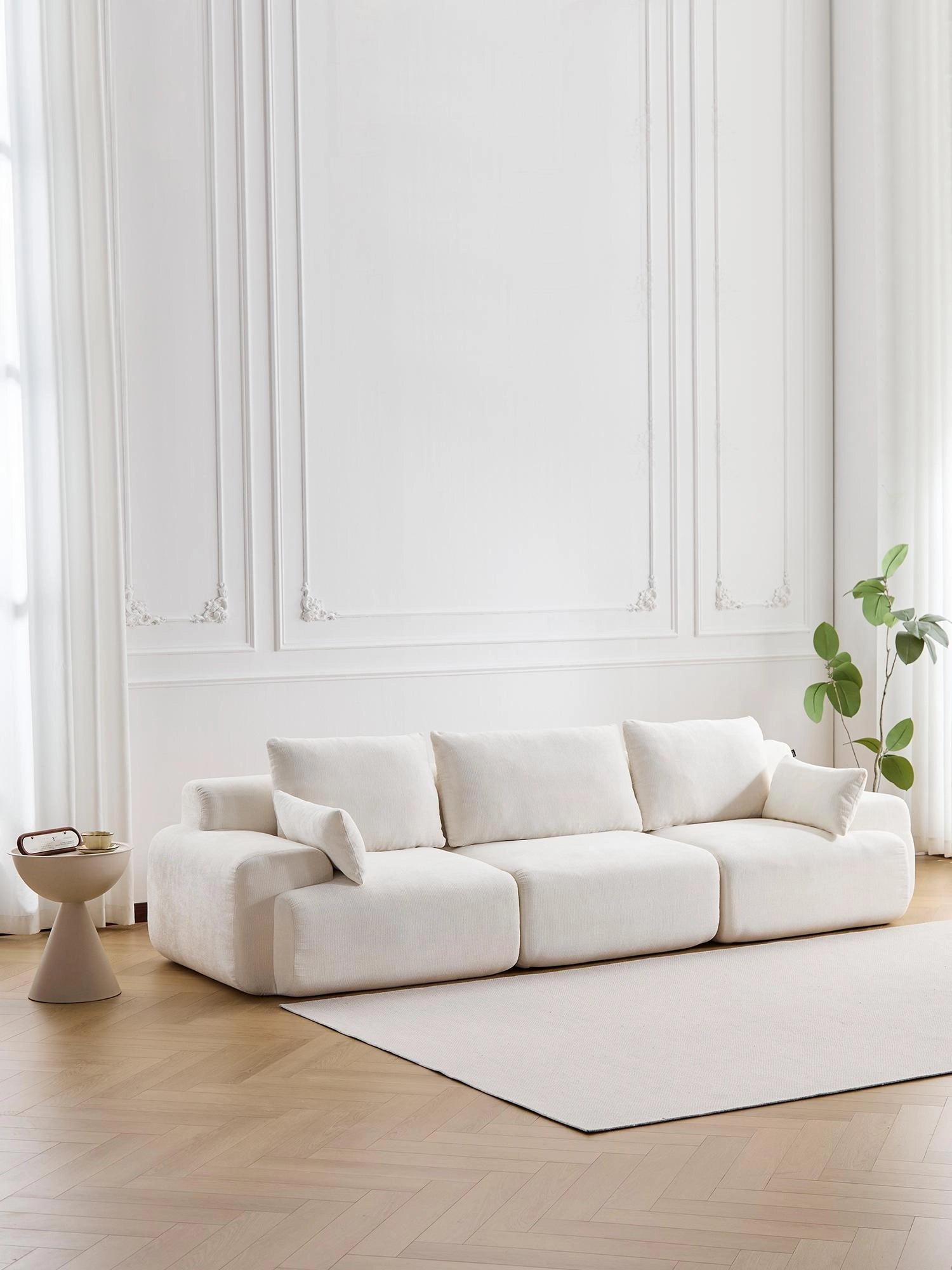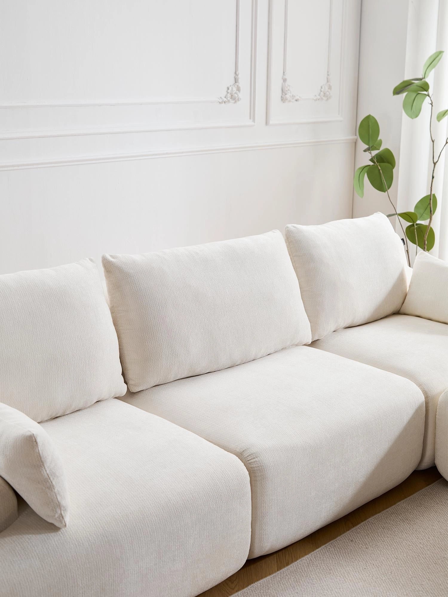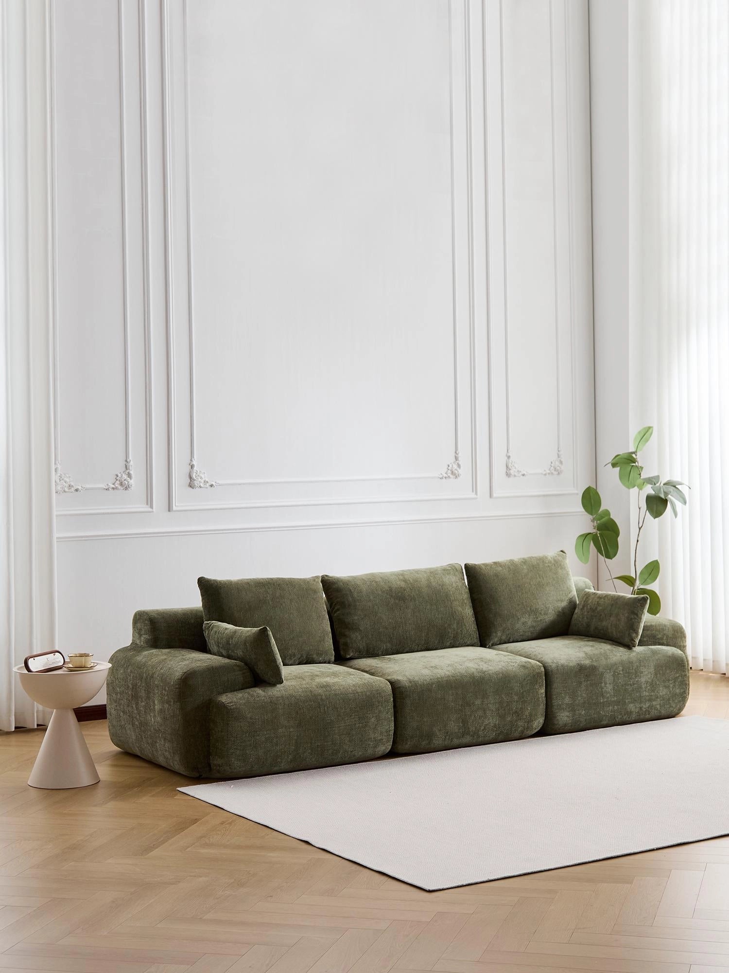 Les coussins structurés assurent un soutien fiable, tandis que les accoudoirs et angles arrondis offrent une silhouette douce et accueillante.