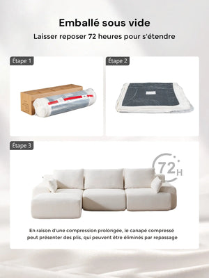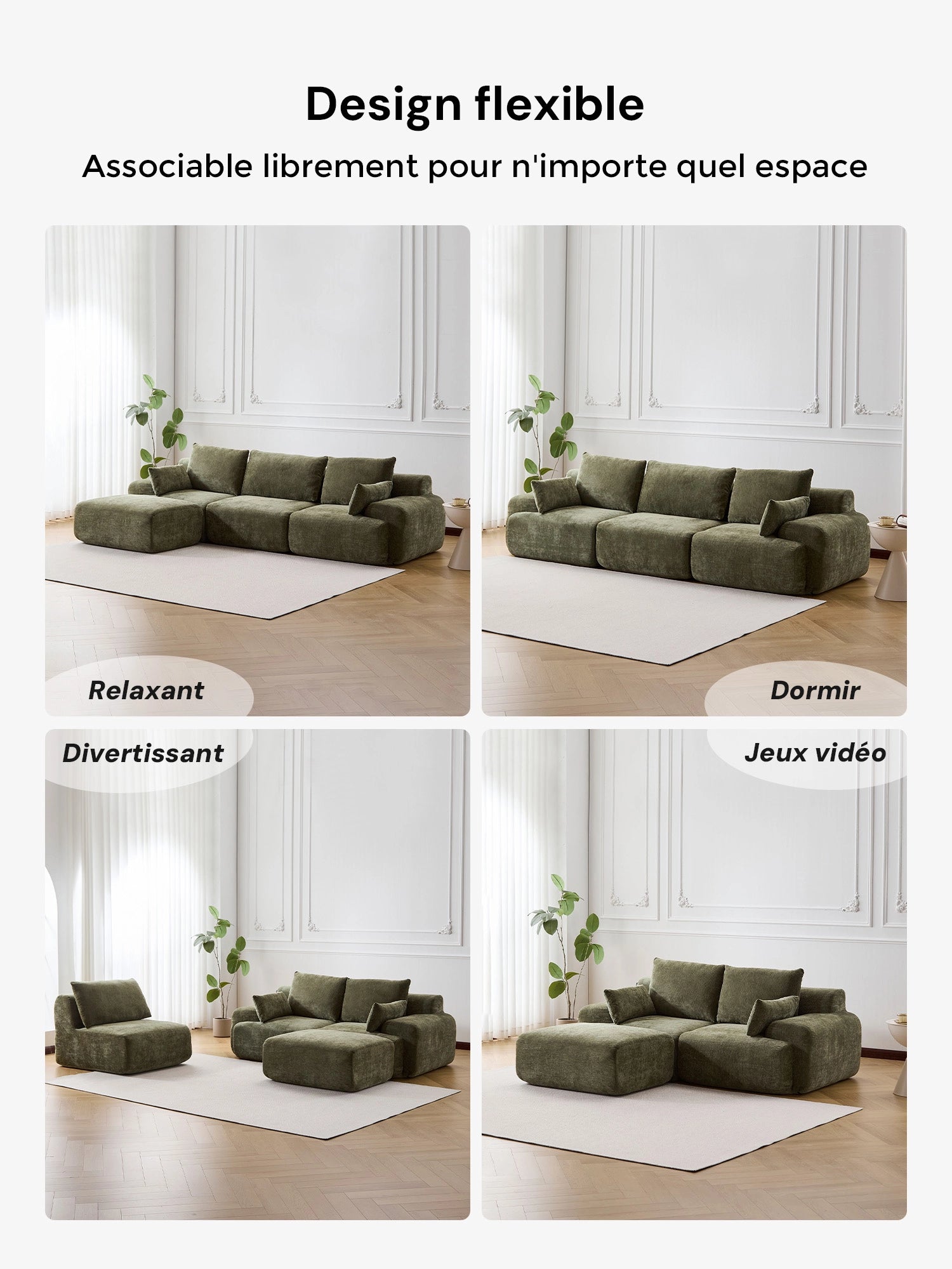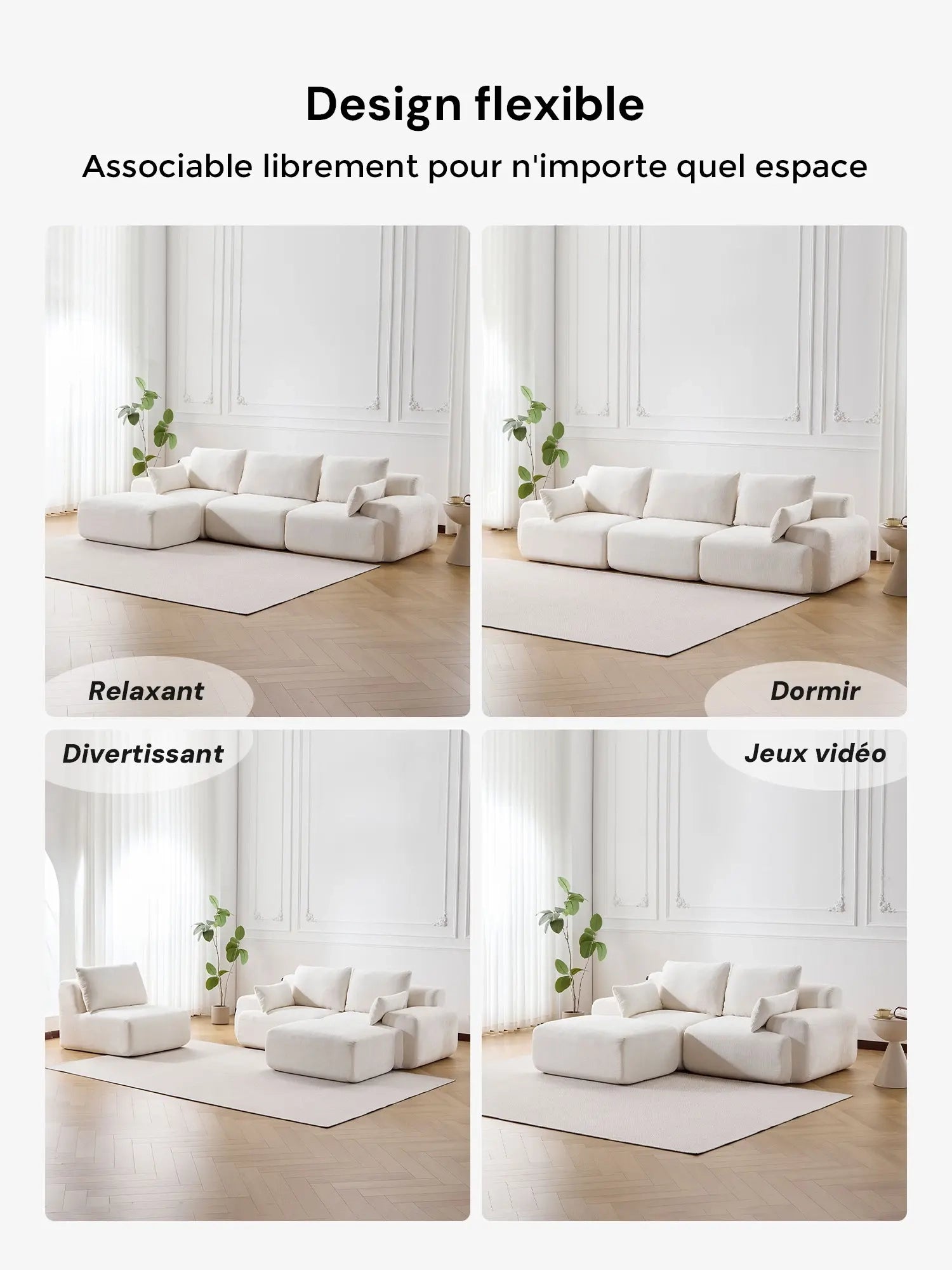 Chaque module peut être facilement repositionné pour créer des configurations flexibles : canapé droit, en L ou modules séparés selon vos besoins.