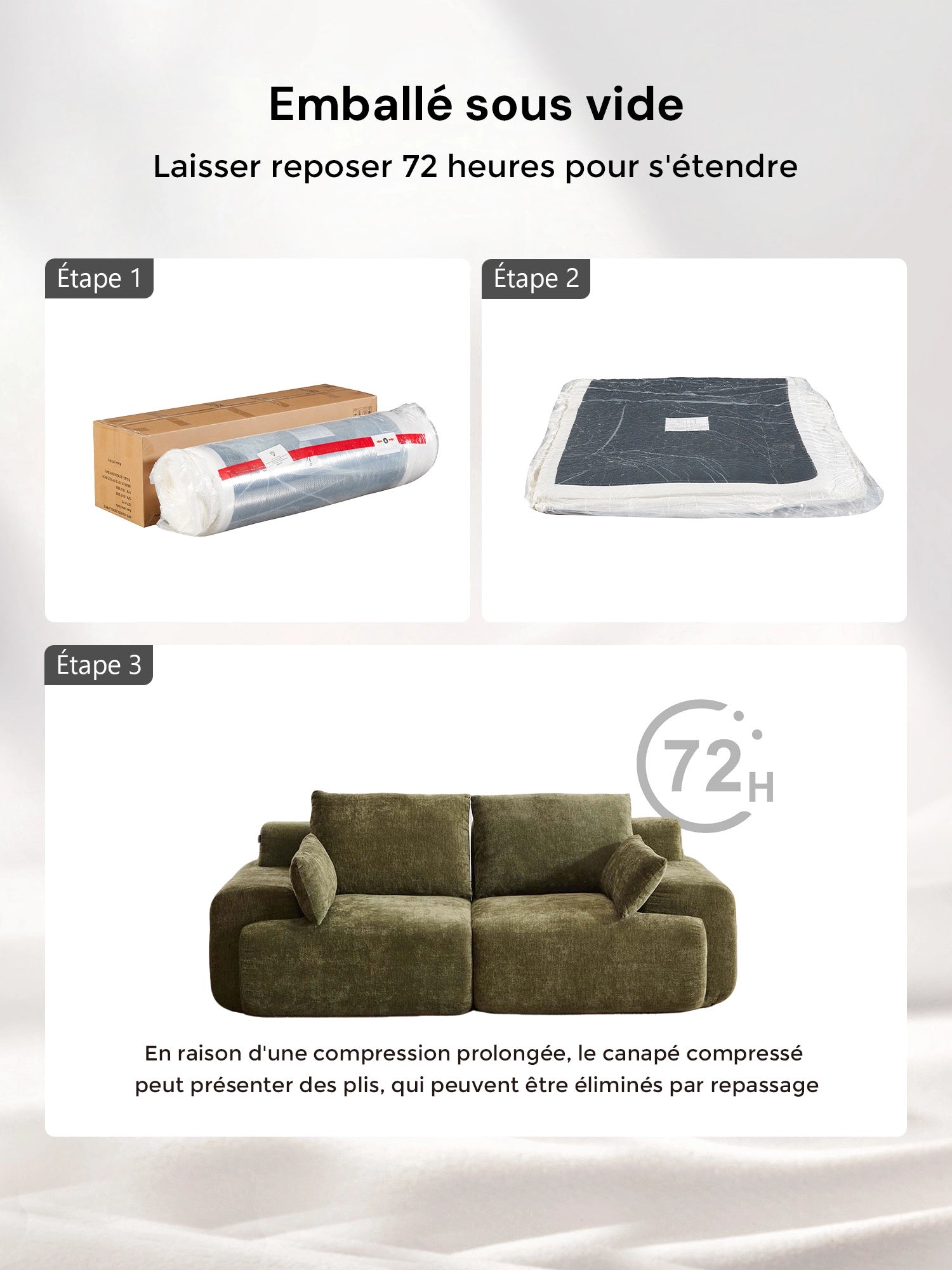 - Articles non éligibles : canapés compressés ou volumineux une fois déballés (sauf défaut ou erreur).